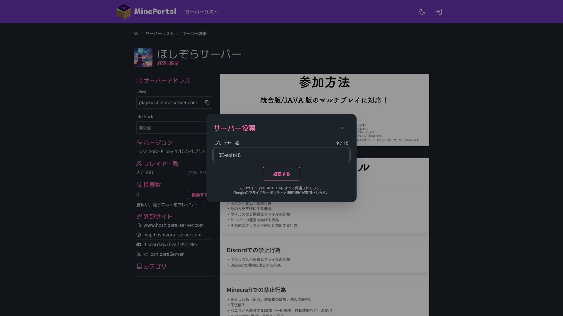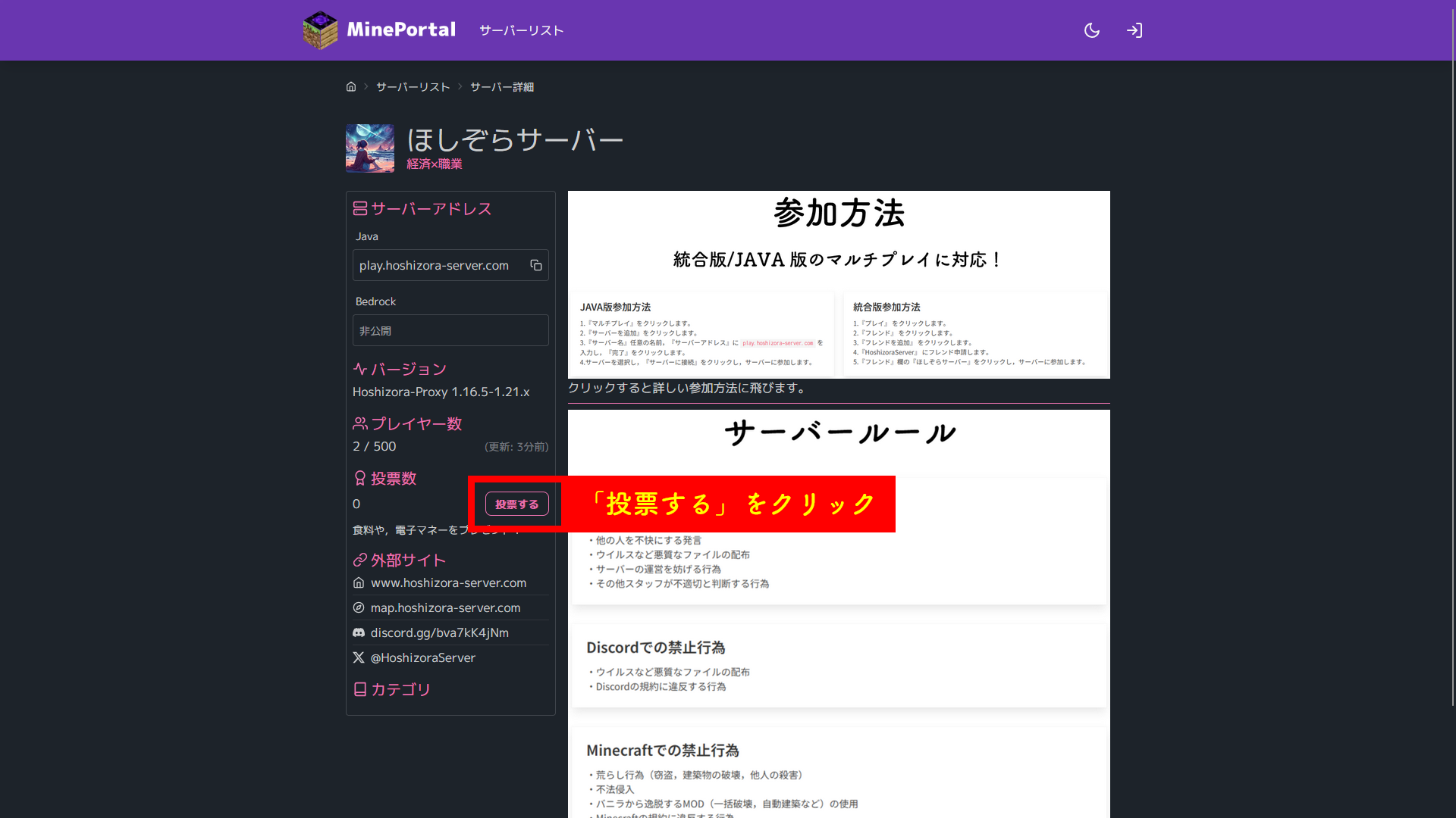 1.ほしぞらサーバーのMinePortalにアクセスし、「投票する」をクリックします。